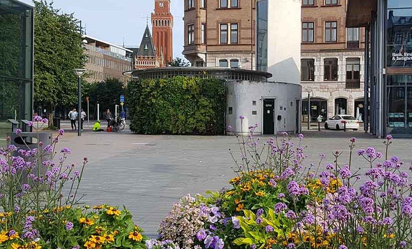 Den 32 m2 stora vertikala väggen på Sundstorgets pumphus i Helsingborg innehåller 21 arter vintergröna perenner och gräs.
