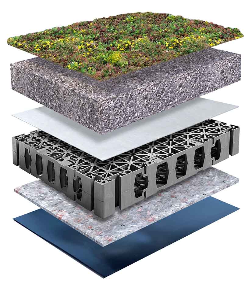 Komplett lösning för tak, bestående av växtlager (sedummatta), dränerande substratlager och ett underliggande system för lagring/disponering av vatten.