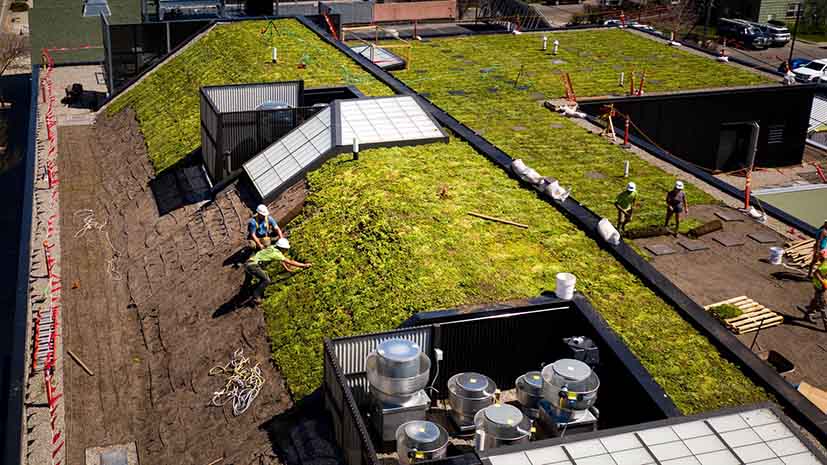 Installation av Sempergreens sedummatta Standard på taket till snabbköpet Co-op i Bozeman, Montana, USA (2019).