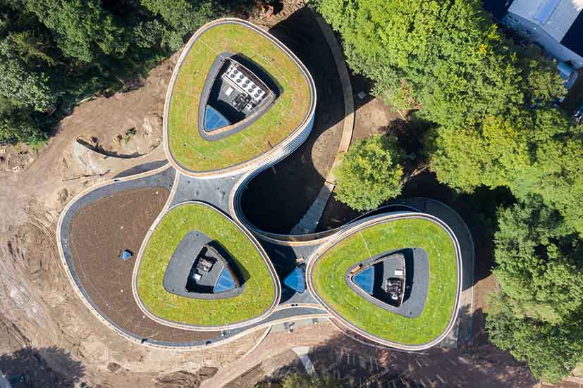 Triodos Banks huvudkontor i Driebergen, Nederländerna. För att skapa de gröna taken används 1 500 m2 sedum-mixmattor från Sempergreen.