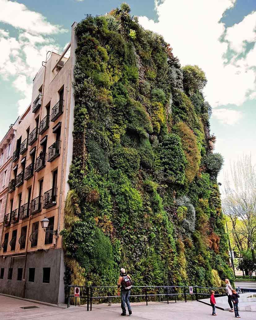 Den här 23,7 meter höga vertikala trädgården hittar du på gaveln av kulturcentret CaixaForum i Madrids kulturkvarter, som öppnade 2008. För designen står botanisten Patrick Blanc, som allmänt brukar krediteras som den vertikala trädgårdens uppfinnare. På väggen, som lika mycket är ett konstverk som en trädgårdsinstallation, har över 15 000 växter från mer än 250 olika arter planterats, de flesta av dem blommande. Bevattningen sker genom perforerade rör i tre nivåer som skapar en ”dimma” längs väggen. Den del av vattnet som inte absorberats av floran eller avdunstar återvinns.